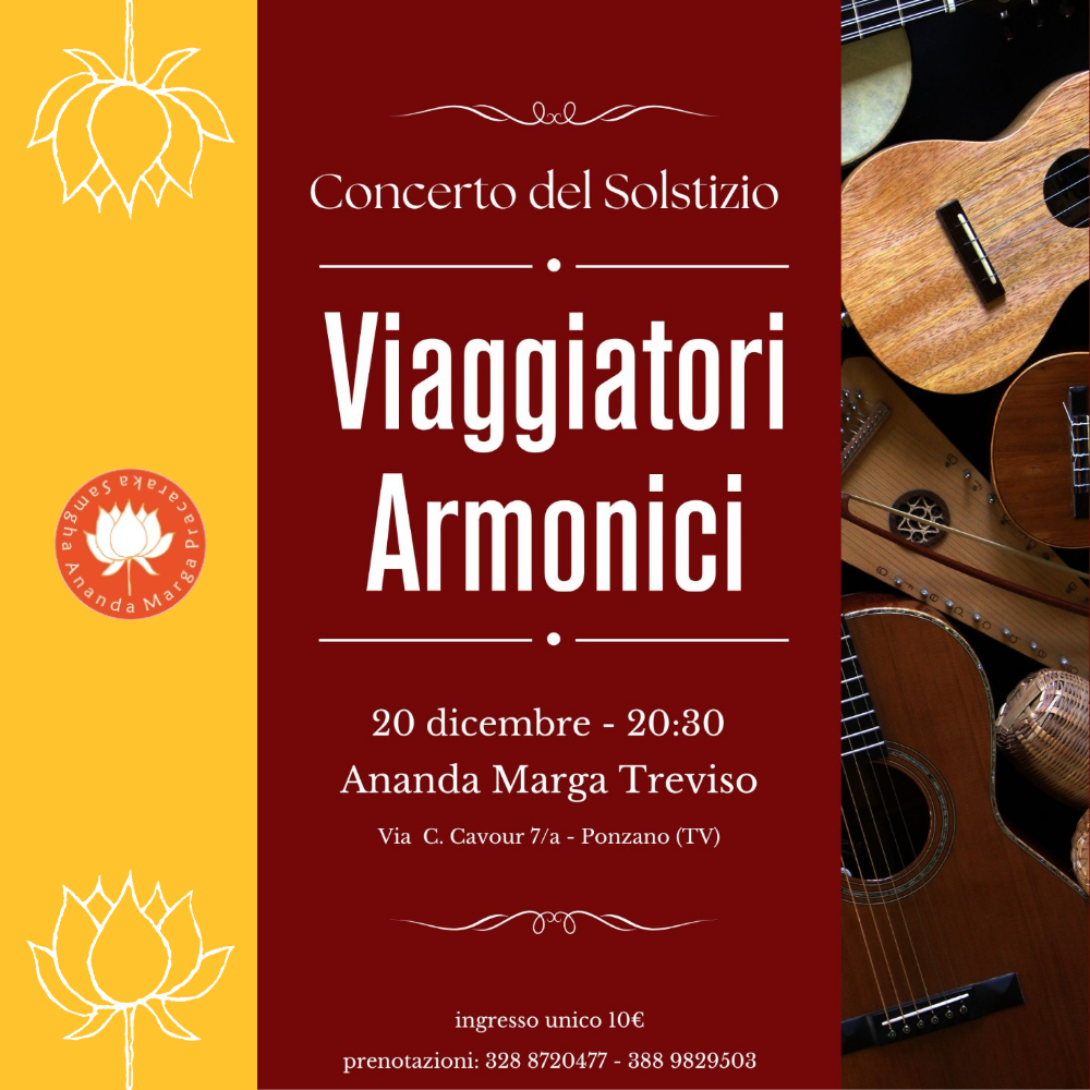 CONCERTO DEL SOLSTIZIO 20 dicembre 2025 h 20:30 I Viaggiatori Armonici si esibiranno in concerto sabato 20 dicembre 2025 alle ore 20:30 presso il Centro Ananda Marga. Viaggiatori Armonici è