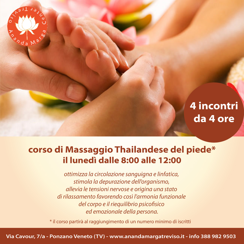 CORSO DI MASSAGGIO THAILANDESE DEL PIEDE Giorgio Segato 4 incontri da 4 ore – Lunedì dalle 8:00 alle 12:00 Il massaggio thailandese del piede, grazie alla sua confermata efficacia, si colloca tra le tecniche curative e terapeutiche elaborate dalle civiltà nel corso dei millenni, per ottenere un equilibrio armonioso nell’unione tra