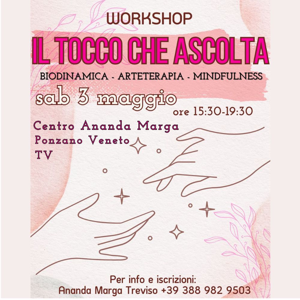 dalle 15:30 alle 19:30 IL TOCCO CHE ASCOLTA Biodinamica- Arteterapia – Mindfulness Conducono Ilaria Emiliani e Cristiana Di Stefano Un pomeriggio di immersione nell’ascolto profondo, attraverso il Tocco Biodinamico, la Mindfulness, l’Arteterapia e il Sound Healing. La biodinamica è un approccio che risveglia l’intelligenza naturale del corpo, favorendo riequilibrio