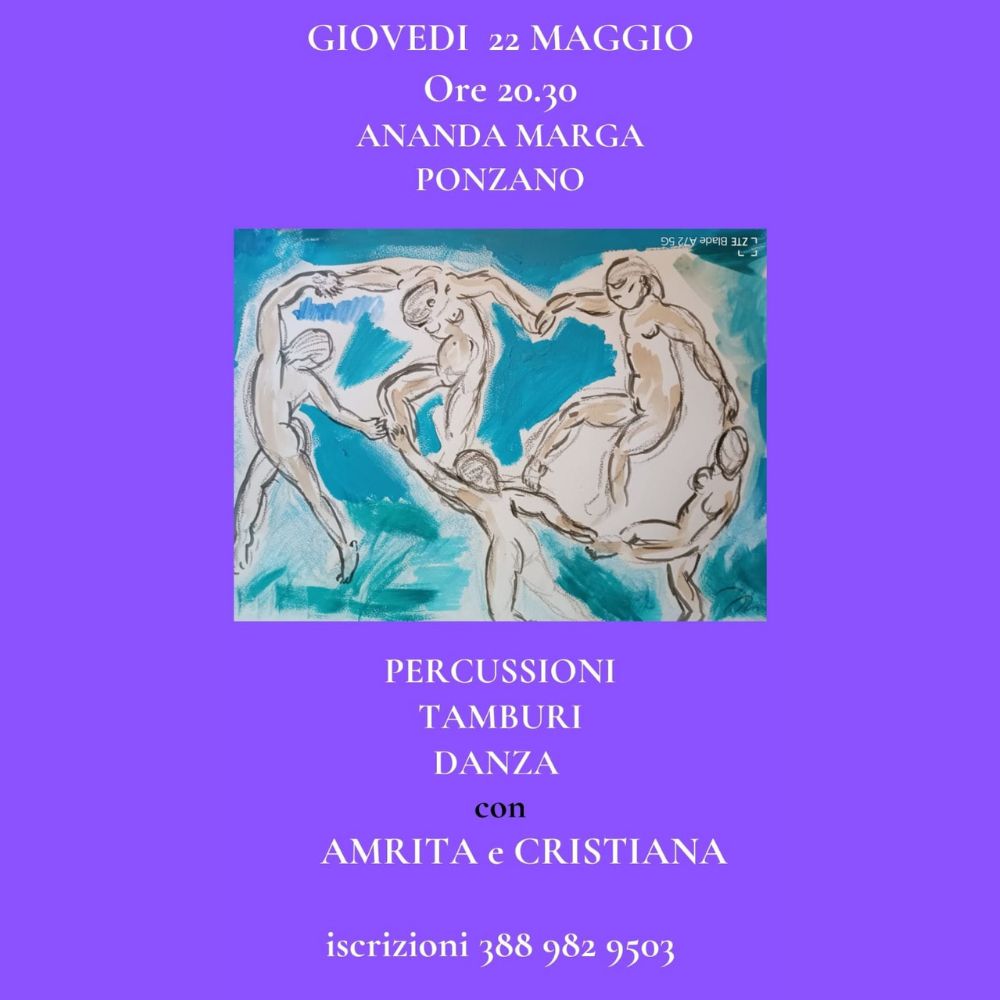 Giovedì 22 Maggio 2025 dalle 20:30 PERCUSSIONI TAMBURI DANZA con Amrita e Cristiana Per info e prenotazioni Whatsapp 388 982 9503