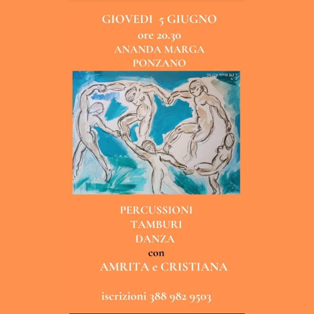 Giovedì 5 Giugno 2025 dalle 20:30 PERCUSSIONI TAMBURI DANZA con Amrita e Cristiana Per info e prenotazioni Whatsapp 388 982 9503
