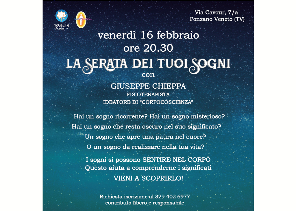 La serata proposta avrà un carattere esperienziale con la possibilità di raccontare un sogno. Potrai così analizzarlo alla luce della tua coscienza corporea risvegliata.